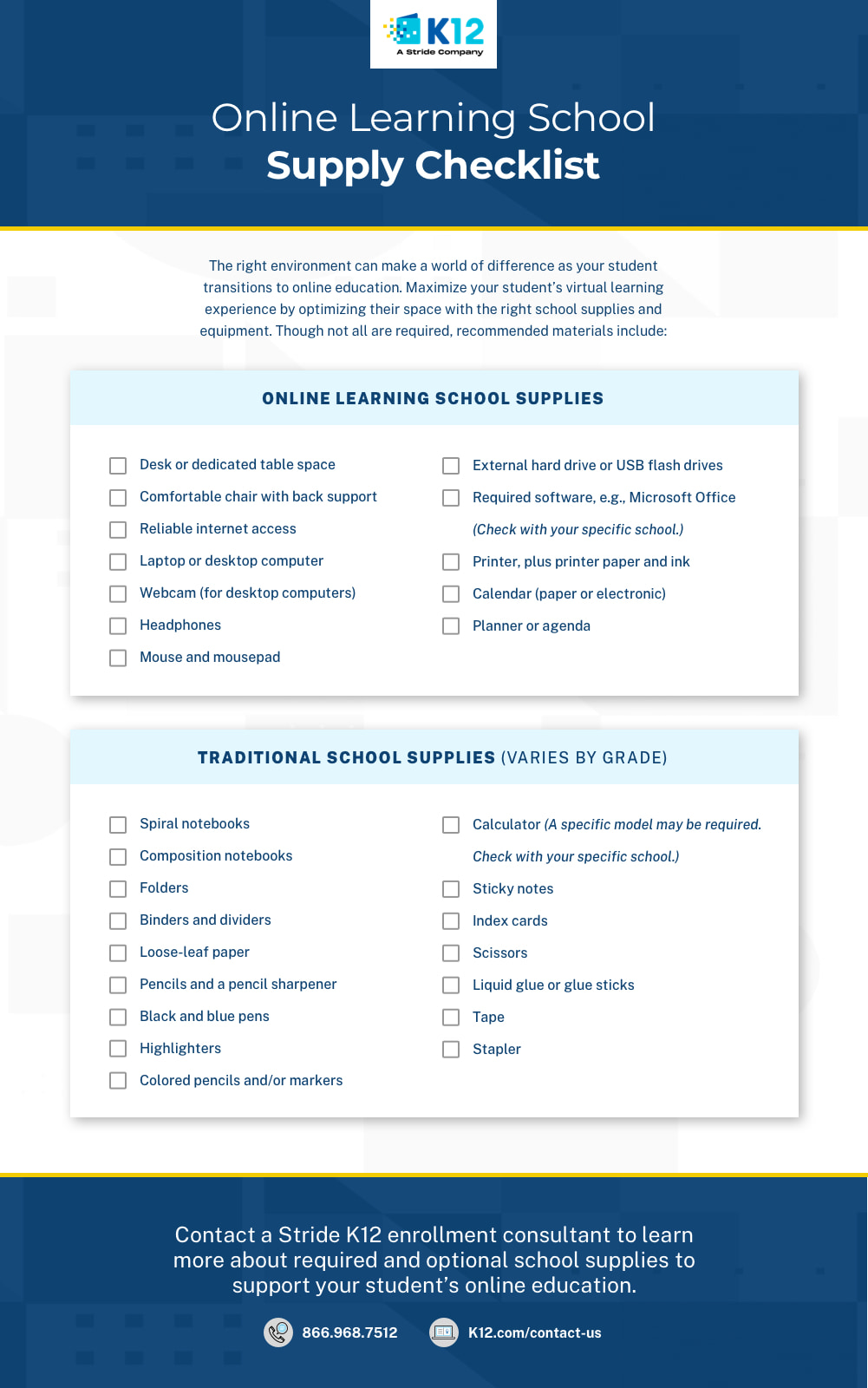Whether you’re still deciding if online school is the right fit for your child, or you’re committed to an online learning environment, this homeschool supply list can help your student be prepared to greet the school year. Though not required for virtual schooling, this checklist includes items that can help create a comfortable environment to learn, maximize the online learning experience, and enable offline learning at home. Find out which supplies can help support your family’s online education.